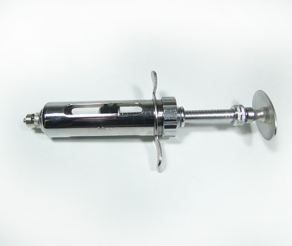 Jeringa de 20 ml. Cuerpo metálico, cilindro de vidrio, cono Luer-Look universal.