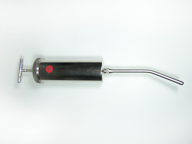 Jeringa de 200 cc de acero inoxidable con balbula dosificadora generadora de presión y canula cambiable.