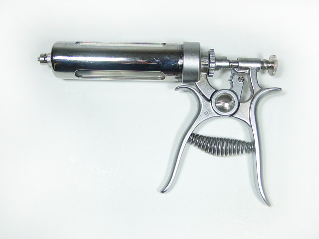Jeringa Walmur metálica con cilindro de vidrio de 50 cc. Gatillo dosificador de 1 a 5 cc.