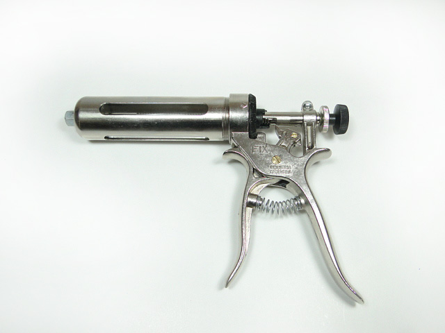 Jeringa metálica FIX de 50 cc con cilindro de vidrio, émbolo de goma y gatillo dosificador de 1 a 5 cc.
