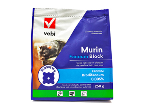 Veneno formato 250 grs. Bloque parafinado de 10 gr. Compuesto activo : Brodifacoum 0,005%