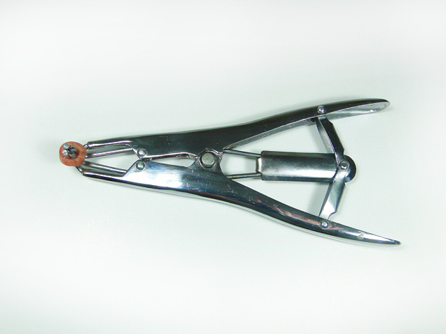Tenaza castradora para postura de anillos de goma utilizados en la castración de cerdos.